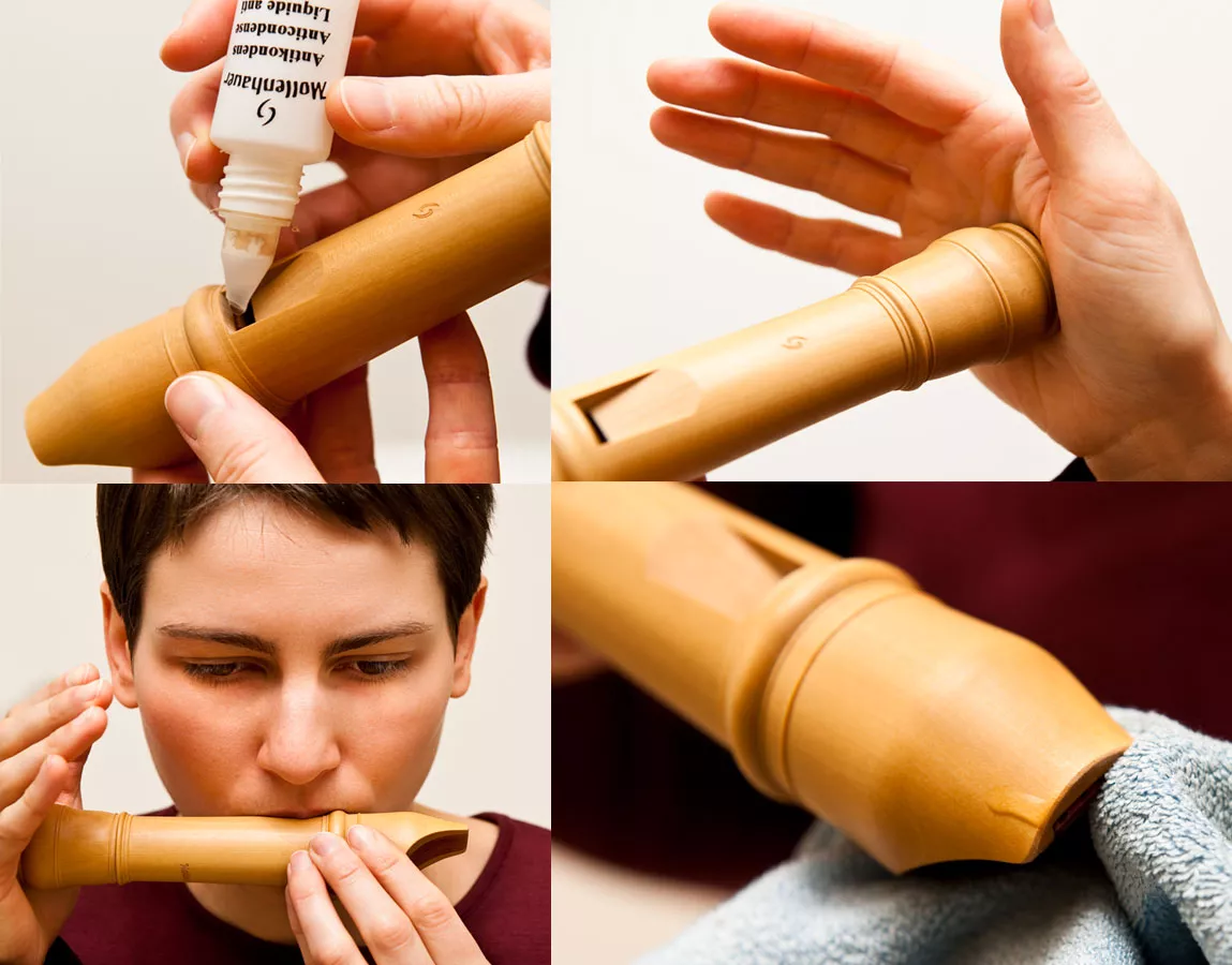 Trocknen Sie die Blockflötenteile nach dem Spiel sorgfältig aus. Hierfür eignet sich eine Wischerstange mit einem nicht fusselnden Baumwolltuch. Vergessen Sie nicht, das sich im Windkanal angesammelte Kondenswasser auszublasen, wie oben beschrieben.